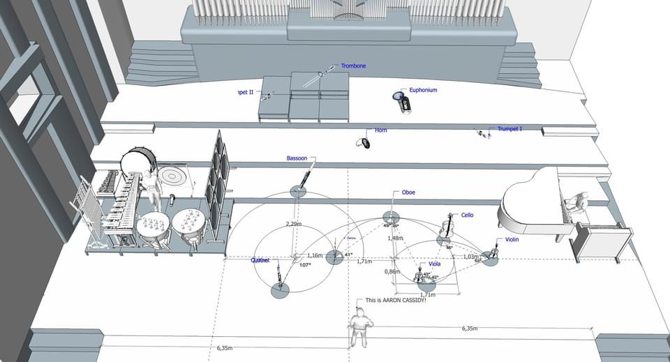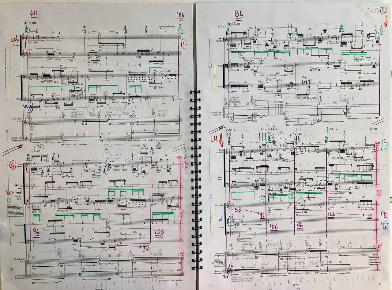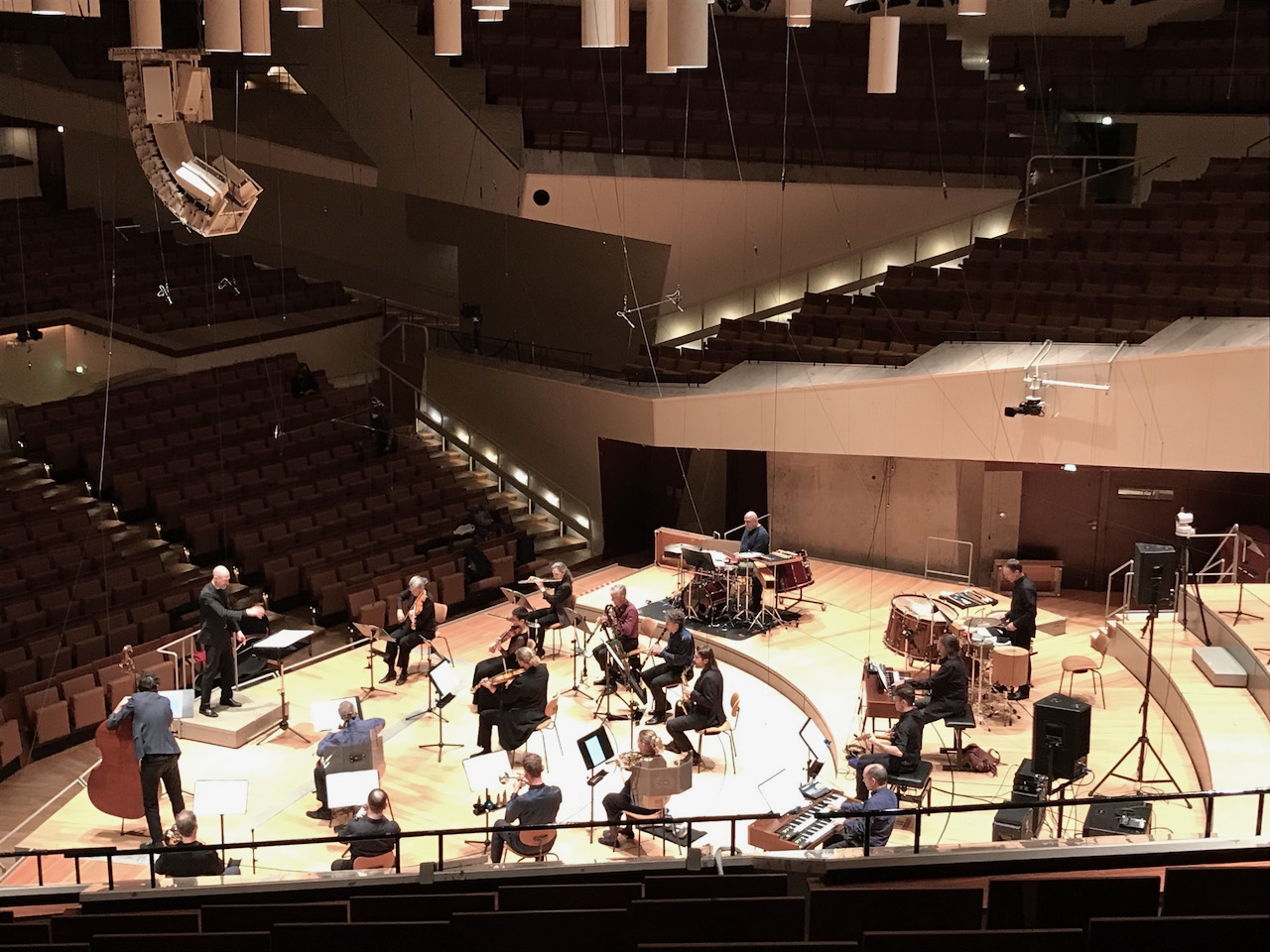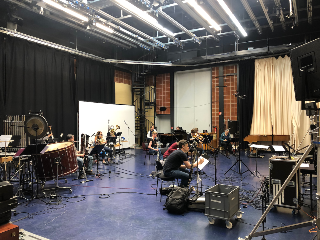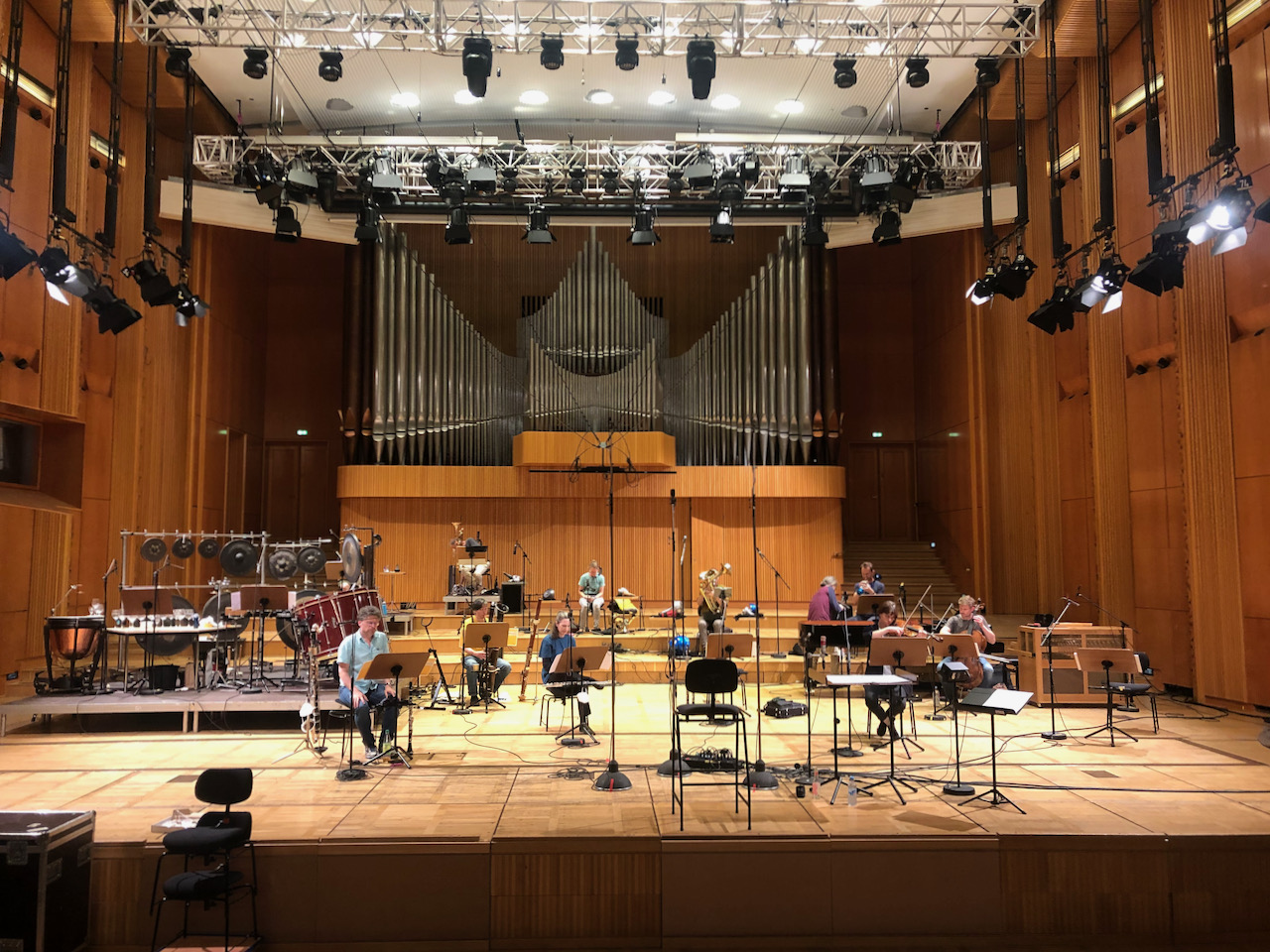 The second project was two recordings of a fantastic new work by Turgut Erçetin, Thousand dead bodies under my bed, all cloaked with the breath of the living, for three simultaneous ensembles, which includes three independent, intertwined works that can be performed separately in three sort of concentric circles of ensembles of increasing sizes. We recorded all three works for broadcast at the WDR Funkhaus (as a live-ish ‘performance’, aber ohne Publikum), and also recorded the large ensemble piece in an all-day studio session for a future release on Wergo. The piece involves some considerable spatialisation—made even more considerable by the WDR’s Covid rules—so our ensemble of 13 players filled a stage designed for an orchestra, all mapped out in Turgut’s exceptionally intricate (and personalised!) stage diagram. [Edit: there’s a promo video about the piece here, which includes some really interesting information about Turgut’s approach to acoustics and spatialisation, plus some very useful words from Carl Rosman about Turgut’s approach to notation.]