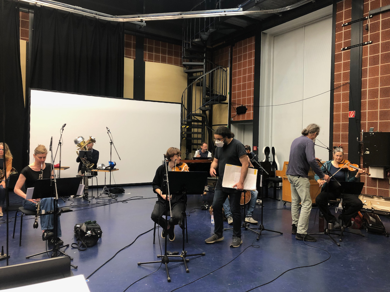 I then did two projects with Ensemble Musikfabrik in Cologne, filling in at late notice for Clement Power, who was unable to travel because of Covid restrictions. The first project was premieres of six wildly different pieces as part of Musikfabrik’s ‘Adventure’ series in partnership with the Institut für Neue Musik at the Hochschule für Musik und Tanz, Köln, which … included a concert! (Mit Publikum!) There was of course significant social distancing on stage, and very strict rules about testing (PCR tests every 48 hours for everyone involved), and of course FFP2 masks anytime anyone wasn’t actively playing, but it was a joy to be in a room making music for an audience. This project also included video recordings of all six works, which I believe will be made available sometime later this year.